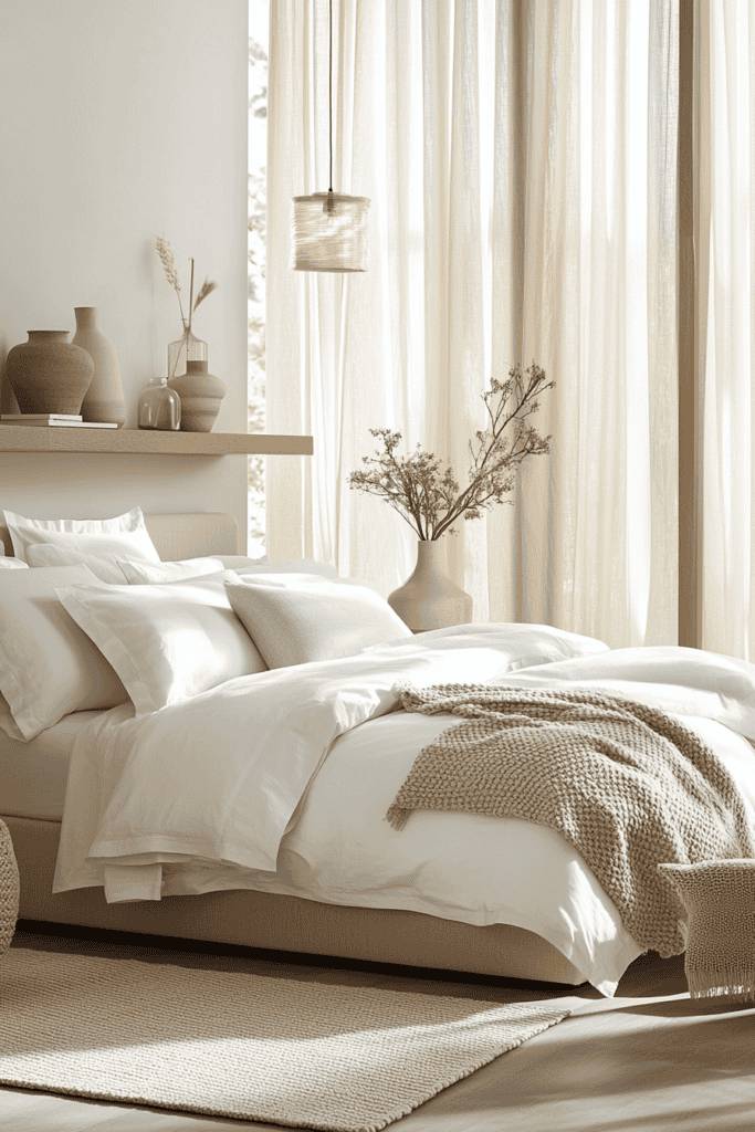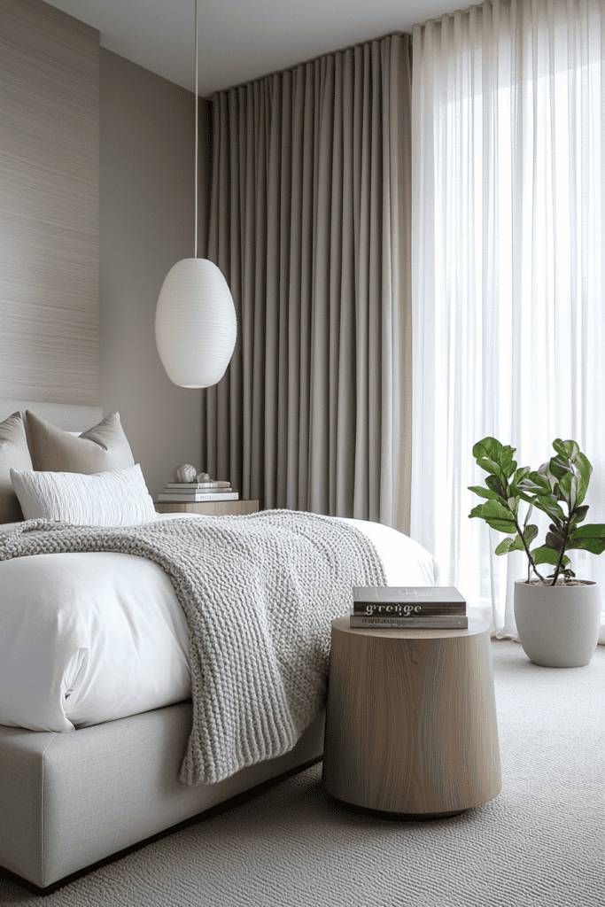 For a calming, minimalist aesthetic, this bedroom embraces soft greige tones, plush textiles, and subtle organic elements. The oversized knit blanket, sculptural pendant light, and sheer curtains enhance the sense of tranquility, while a touch of greenery adds freshness. Perfect for those who want a cozy yet sophisticated sanctuary with timeless appeal.