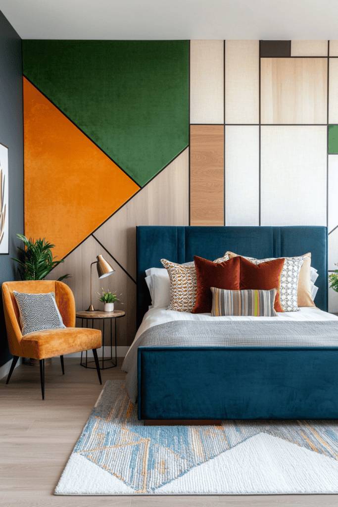 Injecting color and personality, this bedroom features a striking geometric accent wall with deep blues, greens, and burnt orange tones. The bold velvet bed frame, patterned pillows, and textured rug add layers of visual interest. The eclectic mix of modern and retro elements makes this room ideal for those who love vibrant, artistic spaces that feel both luxurious and dynamic.