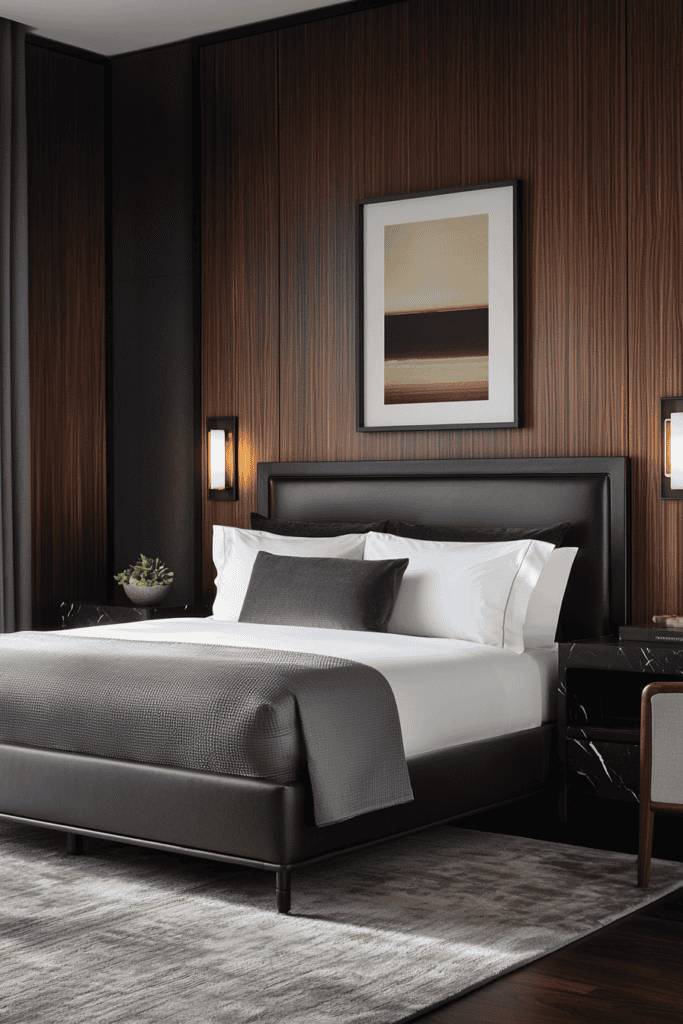 This bedroom exudes refined masculinity with its dark wood-paneled walls, black leather bed frame, and sleek marble nightstands. The warm lighting, soft gray accents, and contemporary artwork add a layer of depth, creating a space that feels luxurious yet cozy. Ideal for those who appreciate classic elegance with a modern twist, this design is both timeless and sophisticated.