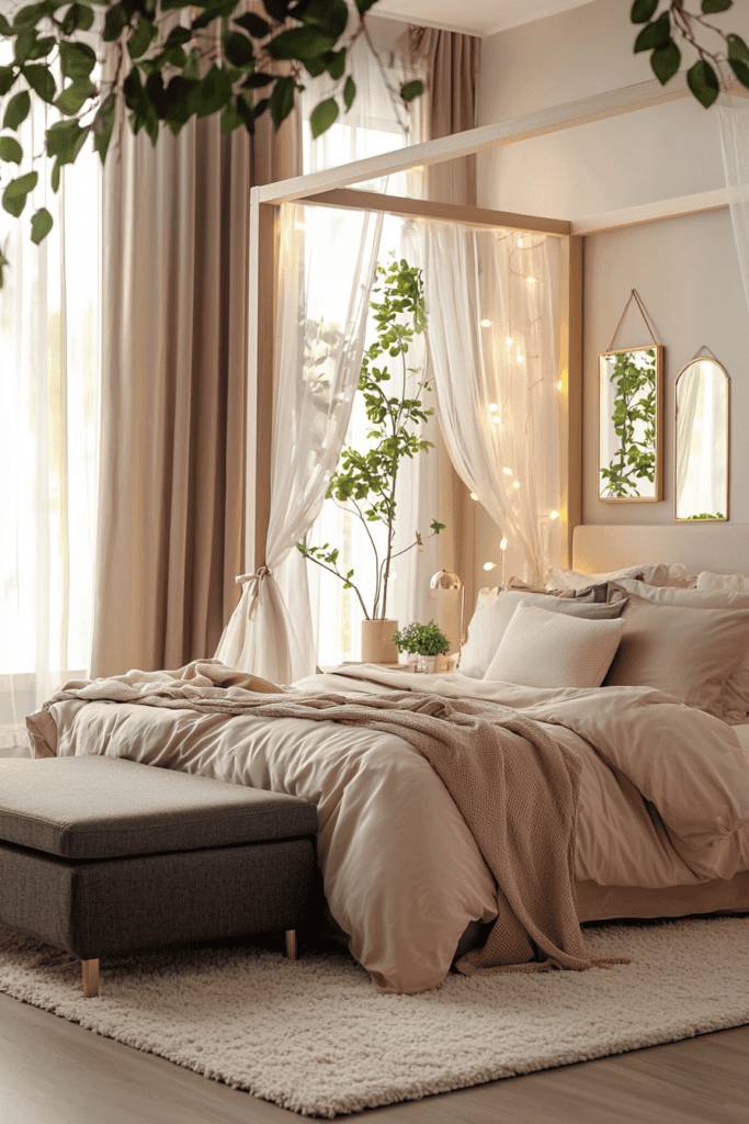 Dreamy and inviting, this bedroom blends soft blush tones, sheer canopy drapes, and fairy lights for a magical, romantic retreat. The gold-accented mirrors, plush bedding, and natural greenery create a warm and inviting space that feels both whimsical and luxurious. Perfect for those who love a feminine yet refined aesthetic, this bedroom is the ultimate cozy sanctuary.
