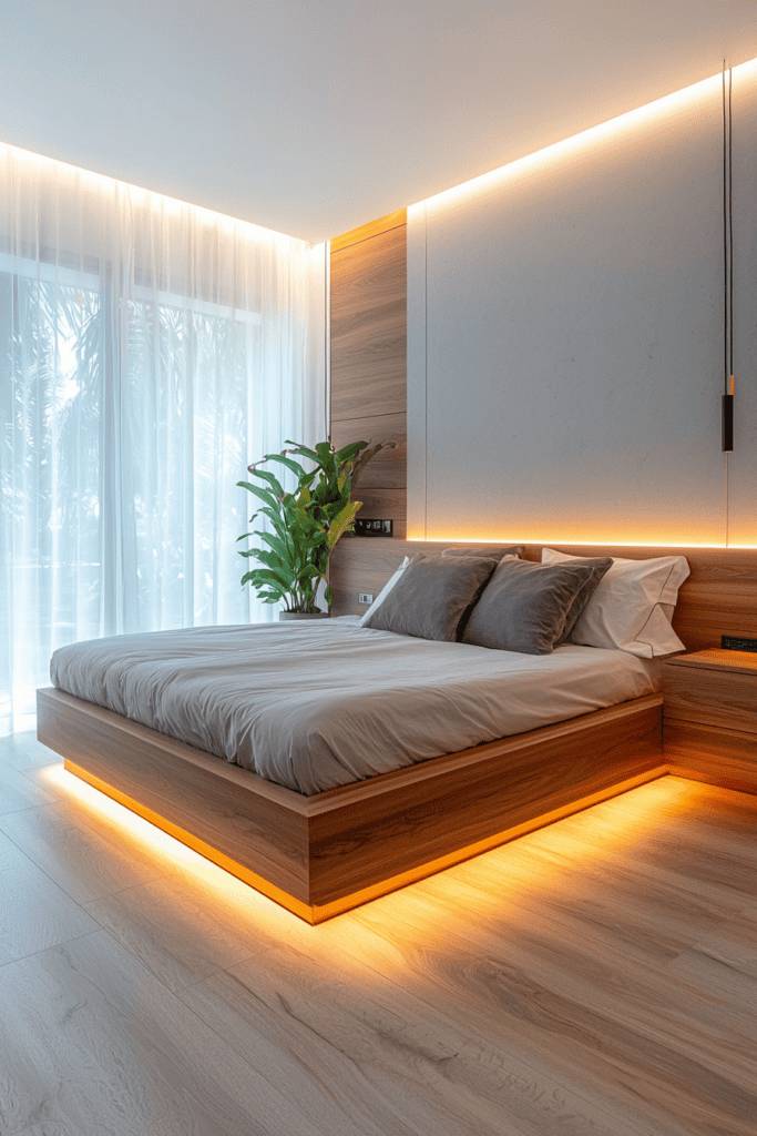 A stunning example of modern innovation, this bedroom features a floating wooden platform bed with integrated LED lighting for a sleek and futuristic feel. The seamless blend of natural wood tones, soft gray bedding, and ambient lighting creates a calming yet stylish atmosphere. Large windows and greenery add a refreshing, organic touch, making this an ideal space for contemporary minimalists.