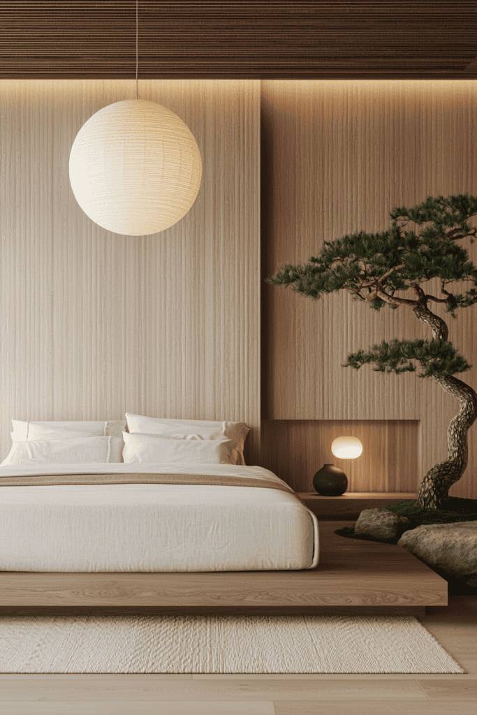 Bringing harmony and tranquility, this bedroom embraces Japanese minimalism with a low platform bed, soft neutral tones, and a stunning bonsai tree. The textured wood paneling, simple lighting, and uncluttered decor emphasize a mindful, serene atmosphere. This design is perfect for those seeking a peaceful and balanced environment rooted in nature.
