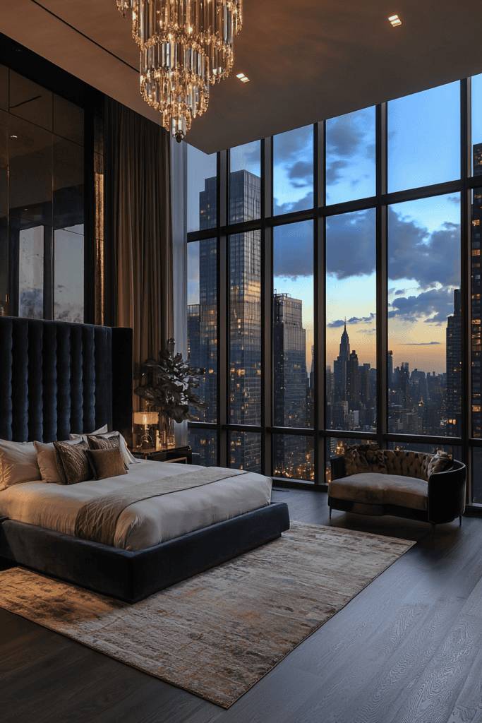 For those who love a cosmopolitan touch, this high-rise bedroom exudes modern luxury. Floor-to-ceiling windows offer breathtaking skyline views, seamlessly blending indoor and outdoor elements.
