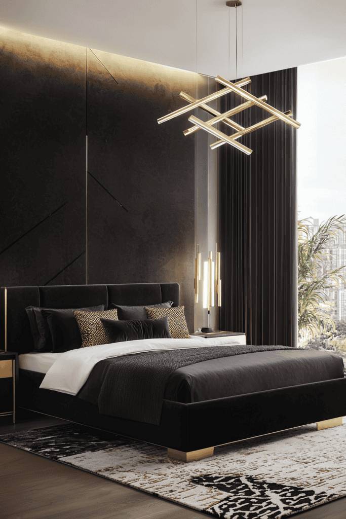 Dramatic, bold, and undeniably luxurious, this black and gold bedroom makes a strong statement. The sleek black walls, geometric gold chandelier, and plush velvet bed create a space that feels opulent and contemporary. Gold-accented pillows and abstract lighting fixtures add extra layers of sophistication, making this the ultimate high-end retreat for those who love a rich and moody aesthetic.