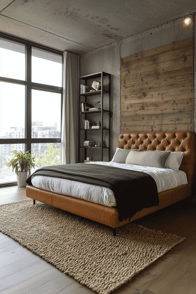 The caramel-toned tufted leather bed adds a cozy contrast, while a textured woven rug softens the space. Ideal for city dwellers who love a mix of industrial ruggedness and homey comfort.
