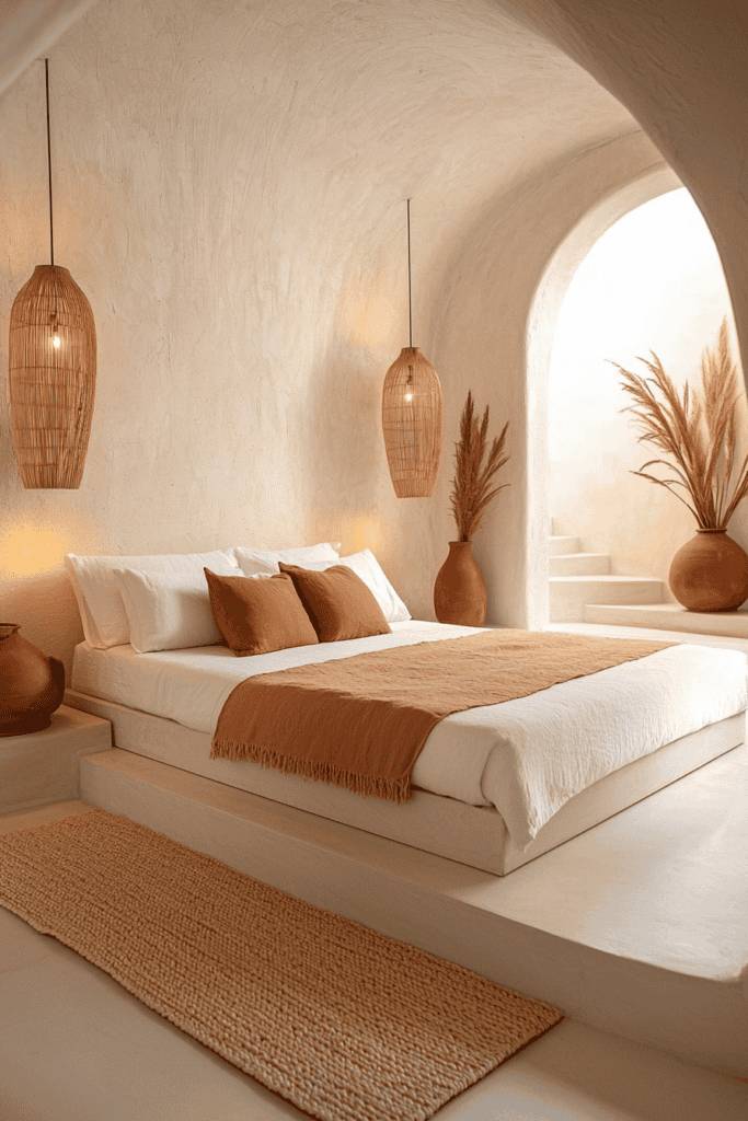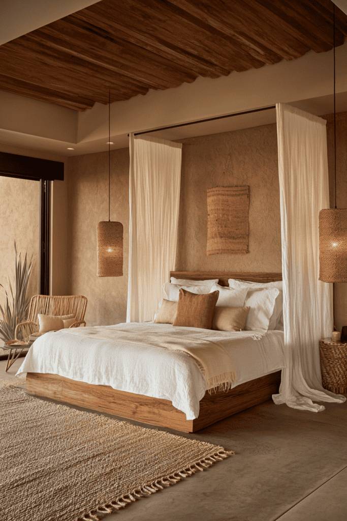 For a relaxed yet luxurious bedroom, this desert-inspired retreat combines natural textures, earthy tones, and flowing fabrics. A low-profile wooden bed, woven pendant lights, and soft white curtains create a cozy and inviting atmosphere. The raw plaster walls and rustic ceiling beams add warmth and character, making this space perfect for those who seek a nature-inspired, bohemian escape.