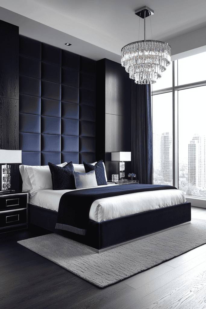 This sophisticated bedroom exudes modern luxury with deep navy tones, an oversized tufted headboard, and sleek black furniture. The dramatic crystal chandelier elevates the space, while the floor-to-ceiling windows offer breathtaking city views. The bold color scheme and high-end finishes make this a perfect retreat for those who love a dramatic yet refined aesthetic.