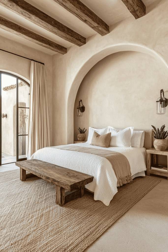 With its arched alcove, exposed wooden beams, and textured plaster walls, this bedroom channels the warmth of a Spanish villa. The neutral bedding, handwoven rug, and vintage-inspired sconces add character, creating a cozy and inviting space. This design is perfect for those who love the blend of old-world charm and modern simplicity.