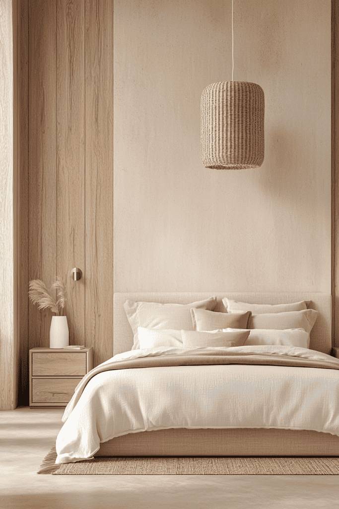 The woven rattan pendant lamp and subtle decor elements, such as dried plants and neutral-toned bedding, add an earthy charm. This design is perfect for those who seek a clutter-free, harmonious bedroom that promotes relaxation and mindfulness.