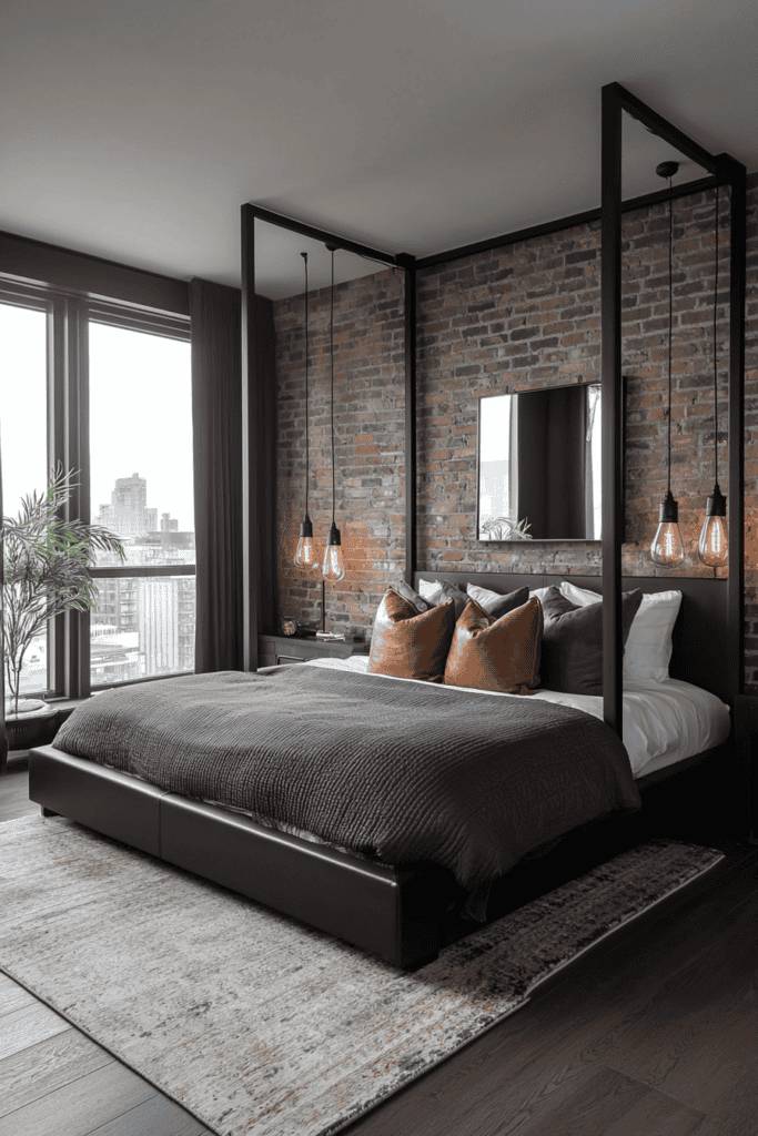 Large windows let in natural light, softening the rugged textures with an airy feel. This bedroom design is ideal for urban dwellers who love a bold, edgy aesthetic with a touch of warmth.