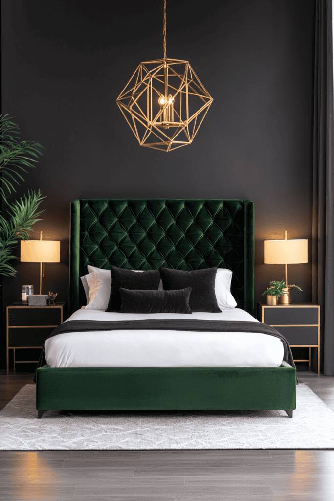 Luxury is all about contrast, and this bedroom masterfully blends deep emerald green with black and gold for a rich, sophisticated look. The tufted velvet headboard brings texture and grandeur, while the geometric gold chandelier adds a contemporary touch.