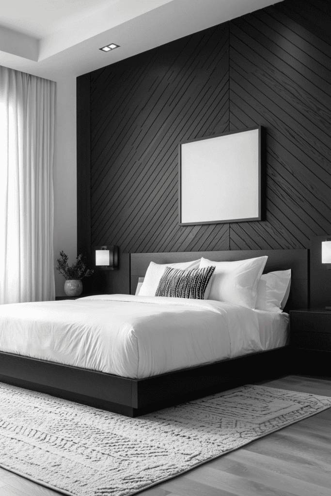 This striking monochrome bedroom proves that black and white can be both modern and luxurious. The diagonal black wood-paneled accent wall adds depth and movement, while crisp white bedding provides a stark yet elegant contrast.