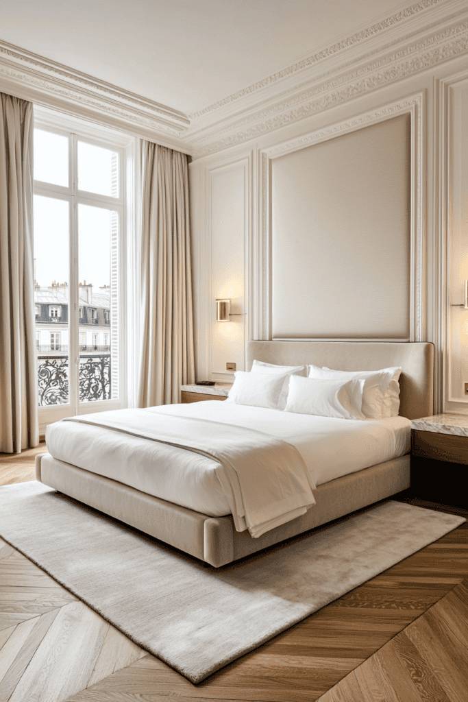 Classic European elegance meets modern minimalism in this refined Parisian-style bedroom. Soft cream tones, intricate wall moldings, and chevron-patterned wood flooring bring an air of timeless sophistication.