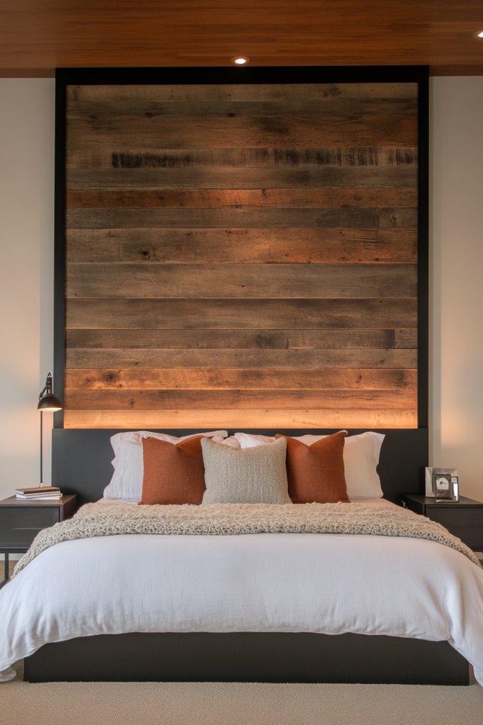 Imagine a weathered reclaimed wood panel behind your bed, its rich textures and imperfections adding depth. Paired with sleek, modern metal accents framing it, this creates a balanced look that’s rustic yet refined. Think warm tones contrasted with cool metallics, reflecting natural light and adding visual interest. The rough-hewn wood feels tactile, inviting relaxation, while metallic touches keep it contemporary.