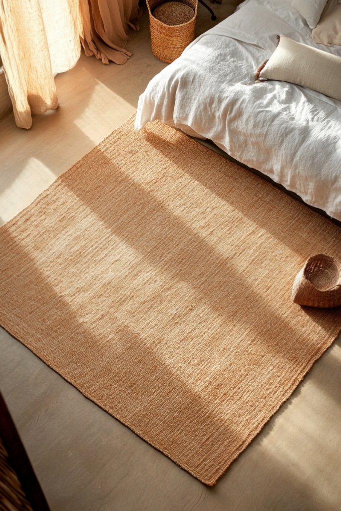 Picture a jute or sisal rug with a soft, woven texture in shades of caramel, rust, or sandy beige. Its organic fibers create a naturally textured surface that feels good underfoot. The neutral tones blend seamlessly with wood, linen, and other earthy materials. The rug’s coarse weave adds visual interest and warmth, making your bedroom feel cohesive and cozy.