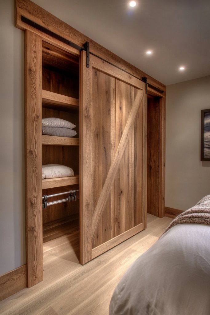 Cluttered closets can ruin the vibe of even the prettiest bedroom. A built-in wooden closet with sliding barn doors combines practicality with rustic charm. It saves space, hides chaos, and adds architectural interest. Want a seamless, stylish storage solution? This might be your new favorite project.