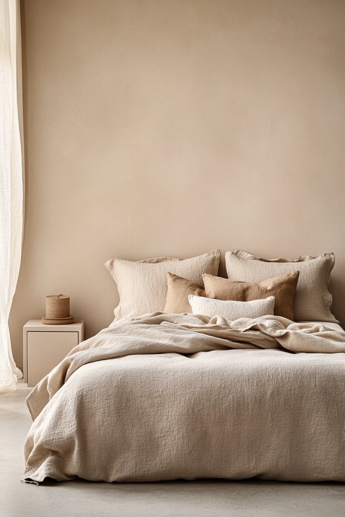 Picture soft beige, warm taupe, and creamy whites layered together in a bed that looks irresistibly inviting. Textured linen bedding adds a subtle richness—think natural wrinkles and a slightly coarse feel that’s cozy yet elevated. The combination of muted colors and tactile fabrics creates a sophisticated, restful vibe, perfect for unwinding after a long day.