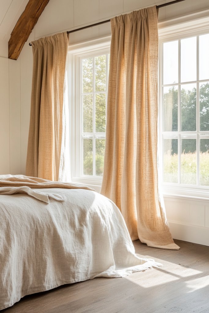 Farmhouse window treatments soften your bedroom’s architecture and bring in a welcoming vibe. They demonstrate that simple textiles can make a big style statement. Once you see how a pair of well-chosen curtains transform your windows, you’ll be inspired to experiment with textures and layering in your space.