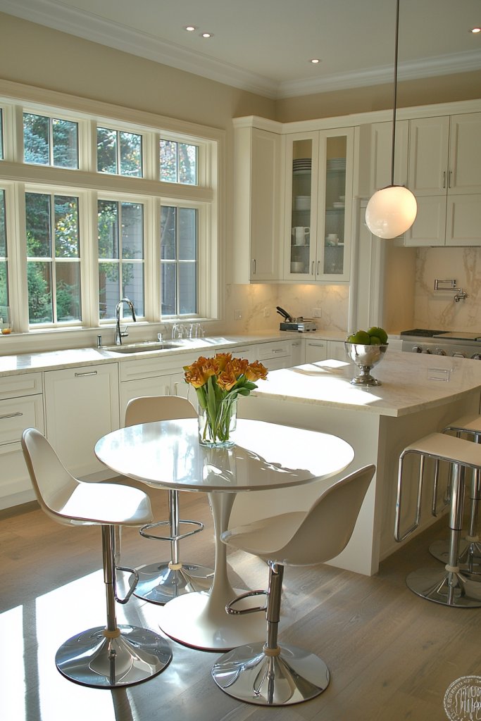You could also opt for a breakfast bar that doubles as extra counter space, seamlessly integrating dining and cooking areas. Stackable chairs or stools are another smart choice, allowing you to store them away easily when guests aren’t around.