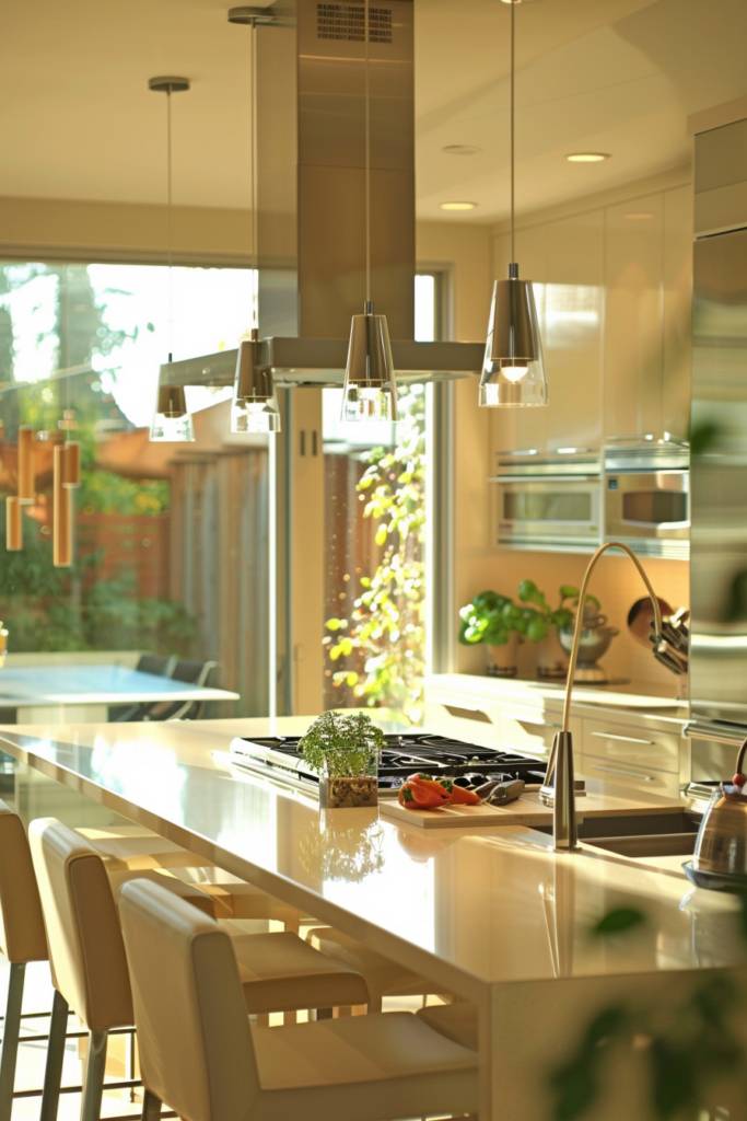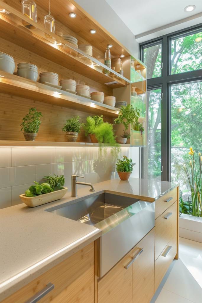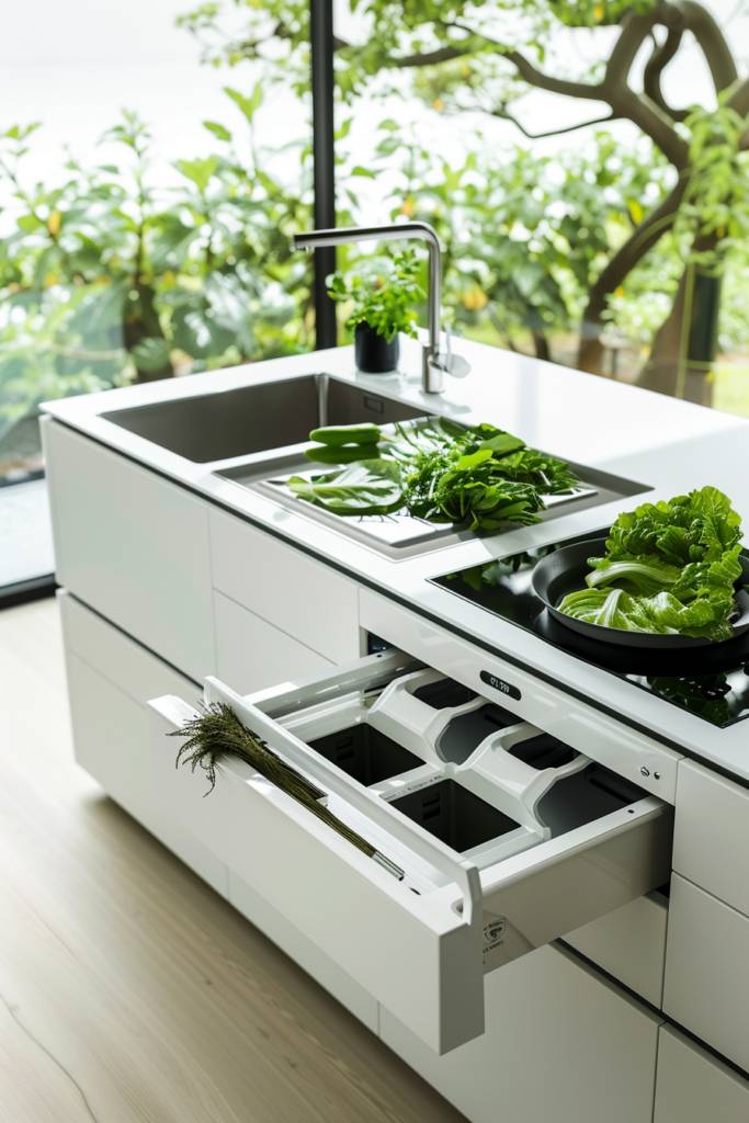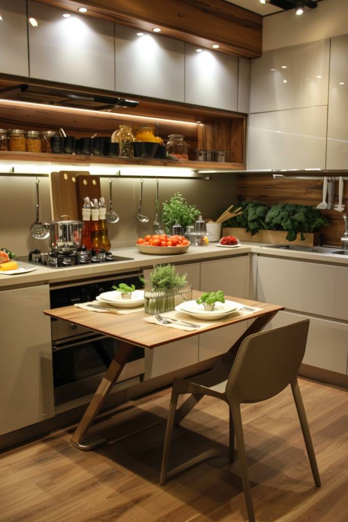 Consider open shelving instead of bulky cabinets—this not only showcases your favorite dishware but also keeps the space feeling airy. Opt for sleek, integrated appliances that blend seamlessly into the design, maintaining a streamlined look.