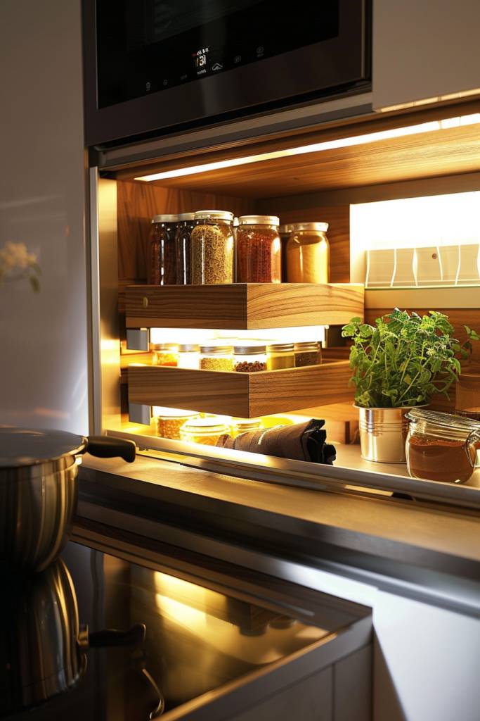 Modern designs now feature sleek materials like wood or acrylic, blending seamlessly with your kitchen decor. You can customize the layout too, with multi-tiered options that enhance storage capacity. Plus, they’re perfect for both small and large kitchens, adding a stylish touch while maintaining functionality.