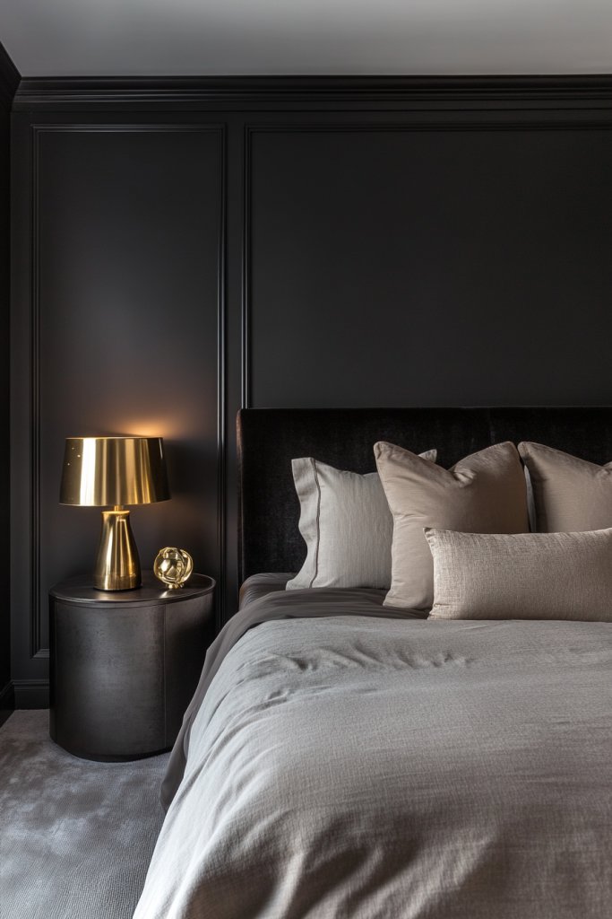Imagine walking into a bedroom with walls painted in a rich charcoal hue that absorbs light softly. Brass fixtures catch the eye without overpowering, adding a touch of glow to the room. Matte gold accents on drawer pulls or picture frames create a subtle shimmer, contrasting beautifully with the dark walls. The texture of plush bedding and a soft cream throw blanket adds layers of comfort, making the space feel warm and welcoming. It’s a perfect blend of elegance and coziness.