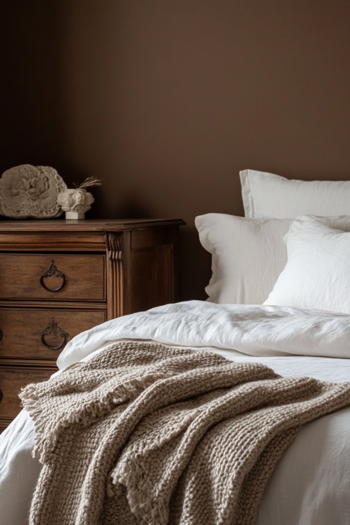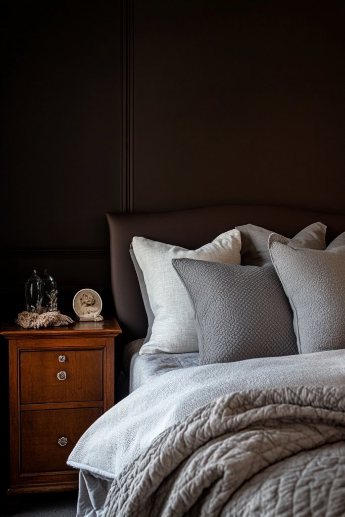 Dark chocolate with soft gray highlights has become a favorite for creating warm, luxurious bedrooms. It proves that deep, rich hues can be both cozy and elegant when layered with textiles and lighting. Your space can be a personal sanctuary of indulgence and style. Ready to embrace the richness?