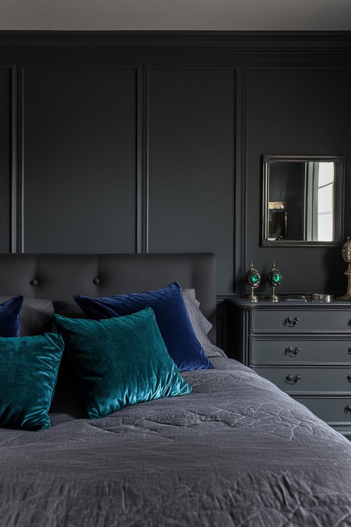 Imagine a deep charcoal wall illuminated by the glow of a jewel-toned velvet cushion or throw pillow. Rich emerald drapes or sapphire accessories add vibrant pops of color. Metallic fixtures in brass or gold accentuate the luxe vibe. The room’s textures—velvet, silk, or satin—create layers of richness. Soft lighting highlights the jewel tones, making the space feel elegant and inviting, perfect for both rest and entertainment.