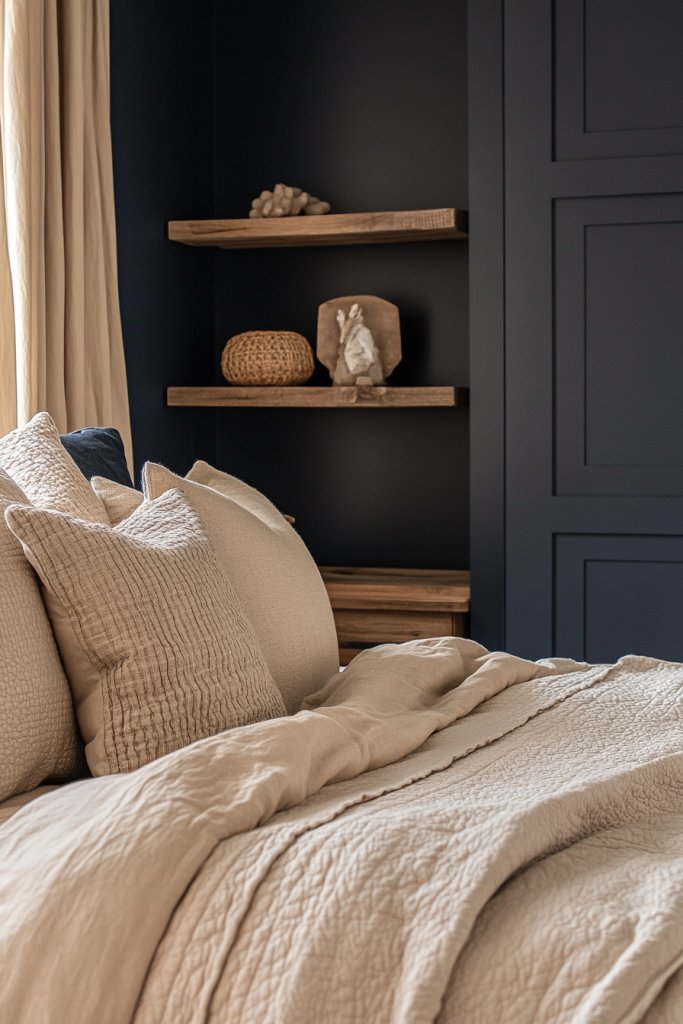 Visualize navy walls that serve as a sophisticated backdrop to layered textiles in beige, cream, and soft browns. Textured curtains, plush rugs, and layered bedding in neutral tones create a cozy, tactile environment. Incorporate warm lighting—think amber-tinted bulbs or soft bedside lamps—to enhance the layered effect. The space feels both elegant and welcoming, like a well-loved library or a lakeside lodge.