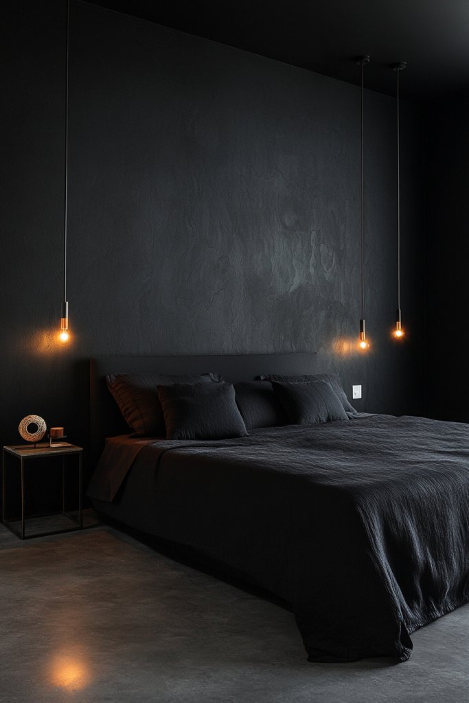 Imagine walls painted in a matte black that absorb light beautifully. Warm amber lighting—whether from sconces, fairy lights, or a bedside lamp—casts a golden glow that makes the space inviting. Textured bedding in neutral tones adds contrast and softness. Subtle metallic accents, like gold or brass fixtures, catch the light and elevate the look. The overall effect is a chic, cozy retreat that balances darkness with welcoming warmth.