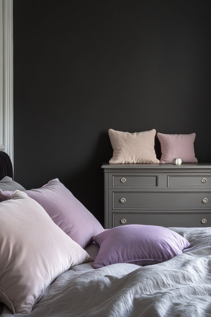 Want a bedroom that’s moody yet soft and inviting? Charcoal walls set the perfect dark, neutral tone, but many worry it might feel too heavy or dull. The trick is adding muted pastel accents—like dusty pink, pale lavender, or soft mint—to soften the look and create a cozy, balanced environment. If you love a sophisticated palette with a gentle touch, this idea is ideal.