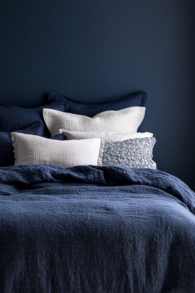 Picture walls painted in a deep navy or midnight blue that seem to draw you into a peaceful ocean. Layered with plush bedding in neutral tones like cream or light gray, the bed becomes a cozy refuge. Textured throw pillows, perhaps in boucle or velvet, add tactile richness without breaking the calm. Soft, diffused lighting casts a gentle glow, highlighting the textures and making the room feel like a tranquil retreat. The overall effect is one of quiet elegance and comfort.