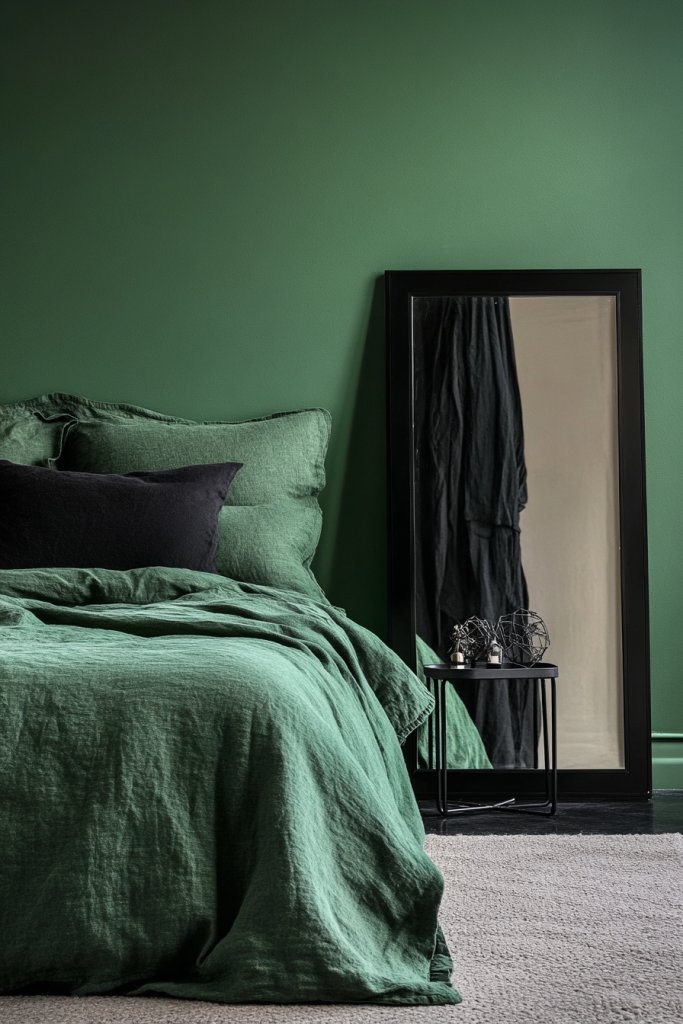 Imagine walls painted in a deep forest green that evoke the tranquility of a woodland canopy. Matte black hardware, such as drawer pulls and light fixtures, add a sleek, modern edge. Wooden elements like a dark-stained headboard or side tables complement the green, reinforcing the natural vibe. Soft textiles, like a textured throw in warm neutrals, add comfort without competing with the bold palette. The result is a bedroom that feels both earthy and refined, like a retreat in the woods.