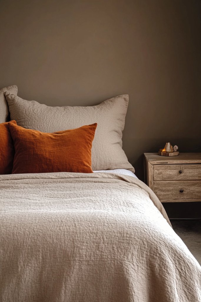 Warm taupe with burnt orange highlights has gained popularity for creating cozy, inviting bedrooms that radiate comfort. It shows that neutral tones can serve as a perfect canvas for vibrant accents. Your bedroom can become a warm retreat that welcomes you home after a long day. Ready to embrace this warm, stylish look?