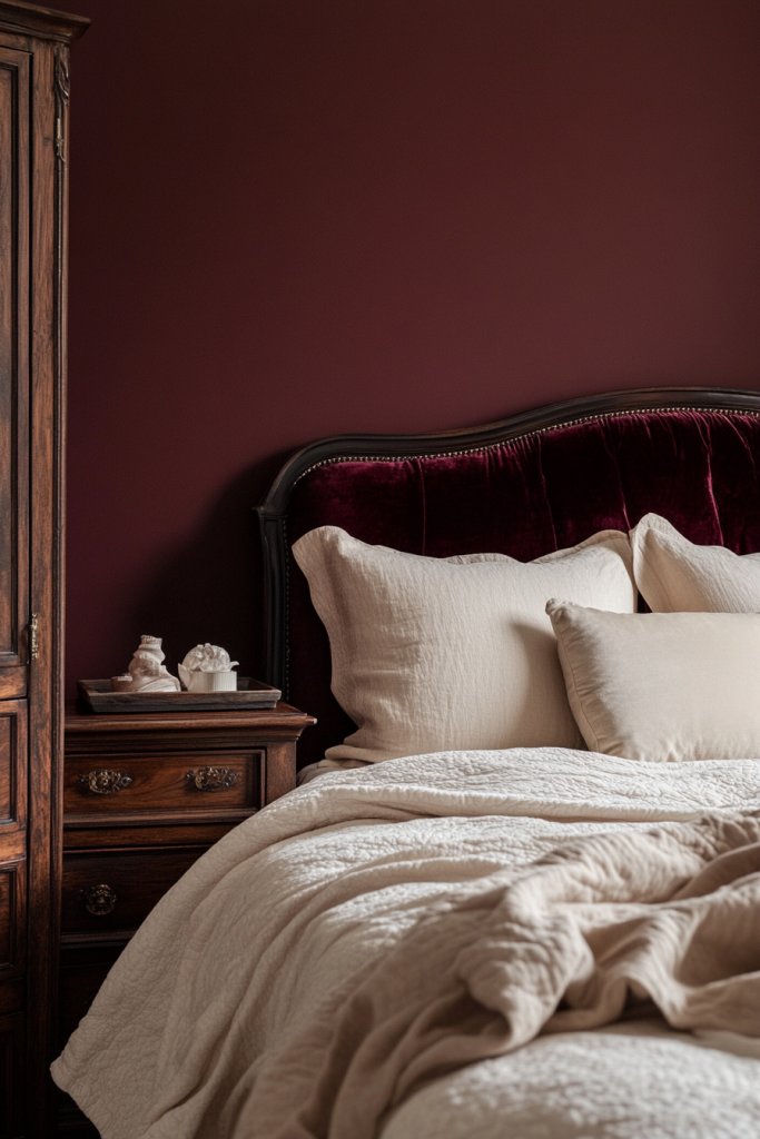 Imagine walls painted in a deep, velvety burgundy that seem to absorb light warmly. Soft, creamy bedding and cushions in neutral shades provide a gentle contrast, brightening the space without dulling the richness. Gold or brass accents in lamps or decorative pieces add a touch of glamor. Light-colored curtains soften the look and bounce light around the room. The overall atmosphere is one of intimate elegance, perfect for relaxing or romantic evenings.