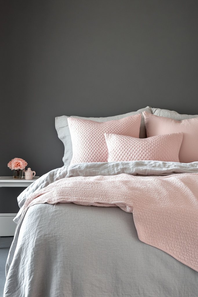 Envision walls painted in a deep charcoal or slate gray, offering a sleek, contemporary vibe. Soft blush pink pillows, lampshades, or throws introduce a delicate pop of color, balancing the cooler tones. Layered textures like knits, silks, or velvets add depth and tactile interest. The room is illuminated by warm, diffused lighting, which enhances the cozy, romantic feel. The overall result is a harmonious blend of modern chic and gentle softness.
