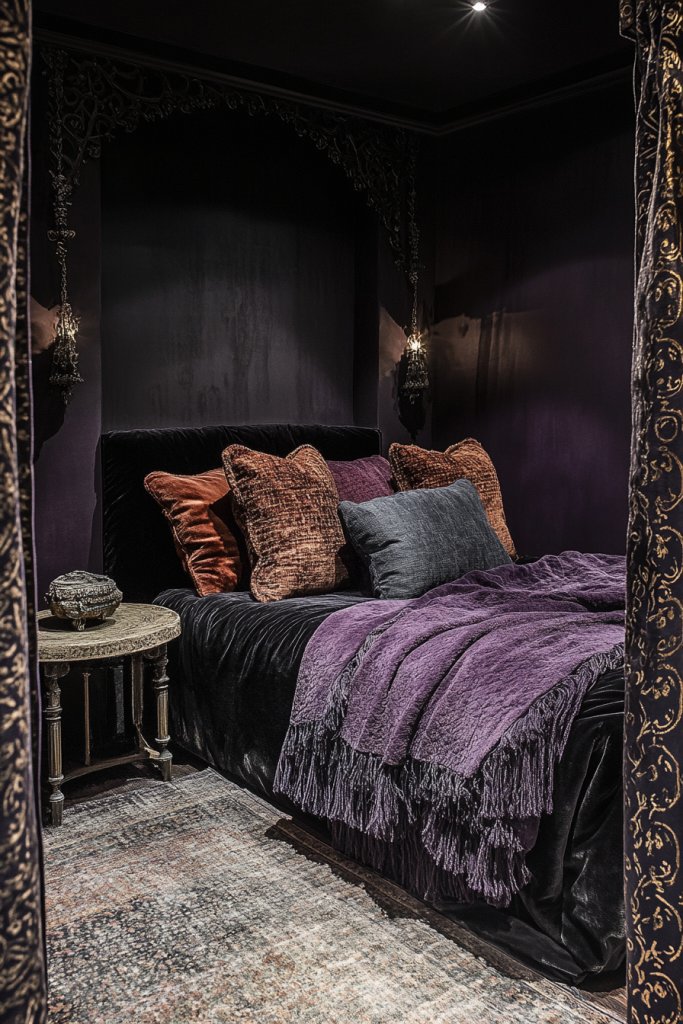 Imagine walls painted in a deep, velvety plum that almost looks black in certain lights. Upholstered headboards in textured velvet or boucle add tactile richness, inviting touch. Soft fabrics like a boucle throw or velvet cushions in complementary shades create layers of comfort. Ambient lighting, perhaps from hidden LEDs or wall sconces, highlights textures and adds warmth. The overall vibe is sultry, inviting, and full of depth.
