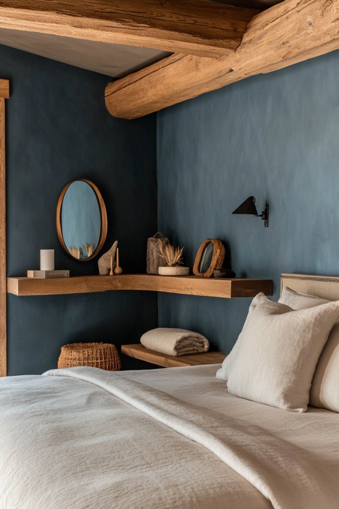 Slate blue with rustic wood elements has become a favorite for creating bedrooms that feel both tranquil and warm. It demonstrates that combining cool tones with natural textures produces a balanced, cozy retreat. Your personal space can reflect your love for nature and comfort. Ready to bring rustic charm into your bedroom?