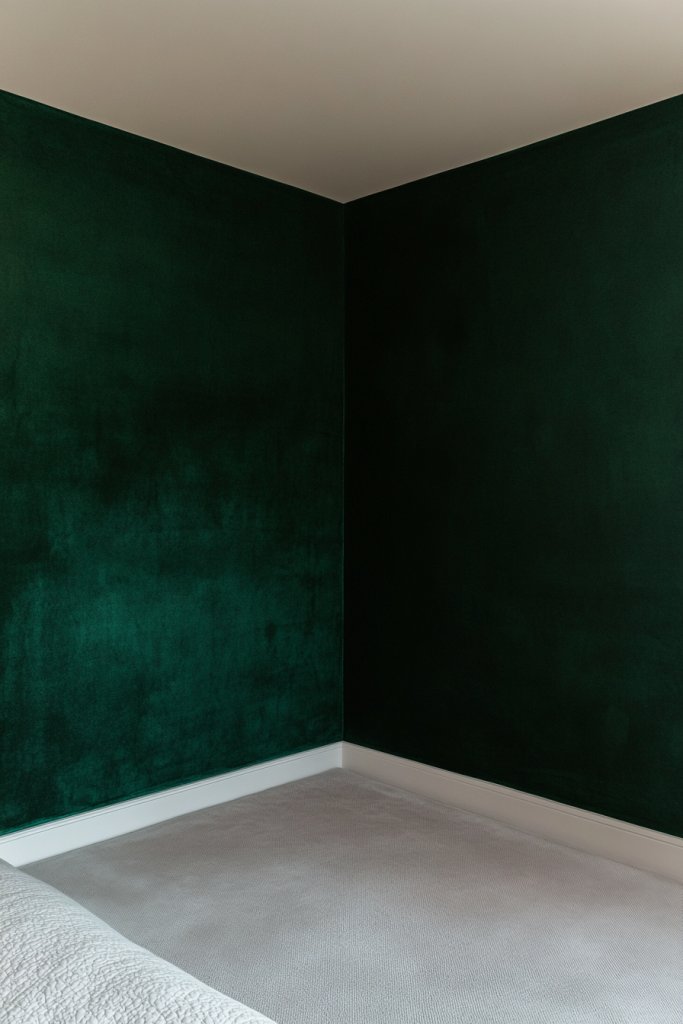 Imagine a wall painted in rich emerald green, with a matte finish that absorbs light softly. The deep hue creates a sense of intimacy, almost like a velvet curtain inviting you into a peaceful retreat. Textured wallpaper with subtle patterns or a painted mural in darker shades can add even more richness. The contrast with lighter bedding and neutral furniture makes the emerald pop, creating a visual anchor that draws the eye.
