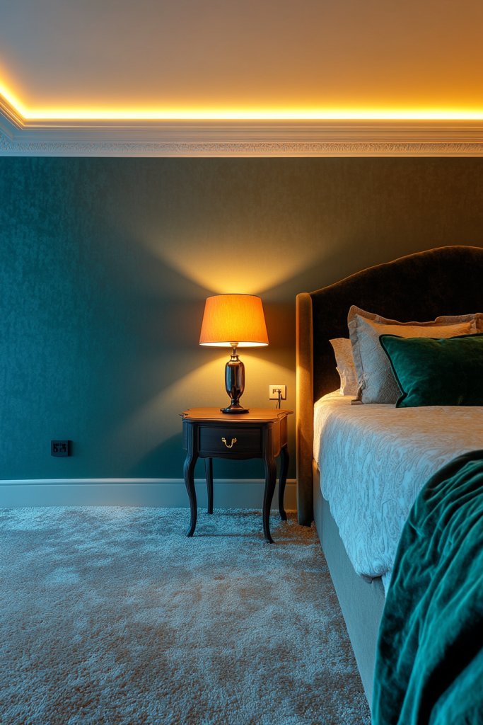 Imagine a room softly illuminated by warm LED strips hidden behind crown molding or under floating shelves. A sleek, adjustable bedside lamp in a warm finish provides focused reading light. The overall glow is gentle and flattering, creating a sense of intimacy. The layered lighting highlights textures and colors, making the room feel layered and inviting.