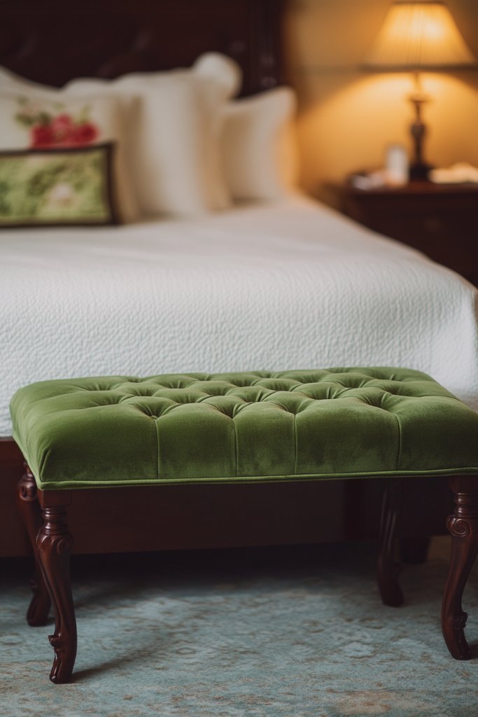 Visualize a plush velvet bench in deep emerald green positioned at the foot of your bed. Its textured fabric catches the light, adding depth and sophistication. It provides a comfortable spot to sit while putting on shoes or laying out clothes. The velvet’s sheen contrasts beautifully with matte or textured bedding, creating a layered, inviting look.