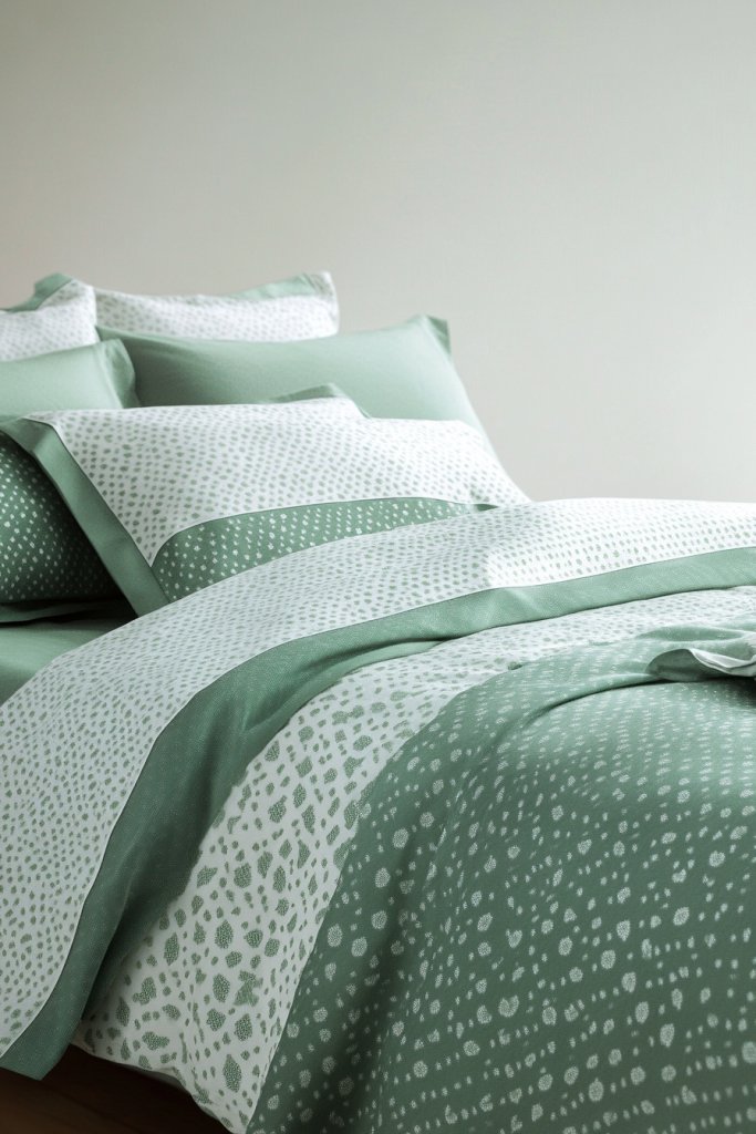 Imagine crisp white sheets with a delicate green embroidery or a faint geometric pattern in shades of green and white. Layer with matching pillowcases and a duvet cover that has understated patterns—like tiny florals or subtle stripes. The subtle design adds visual interest without overwhelming the senses. The overall effect is clean, elegant, and soothing.