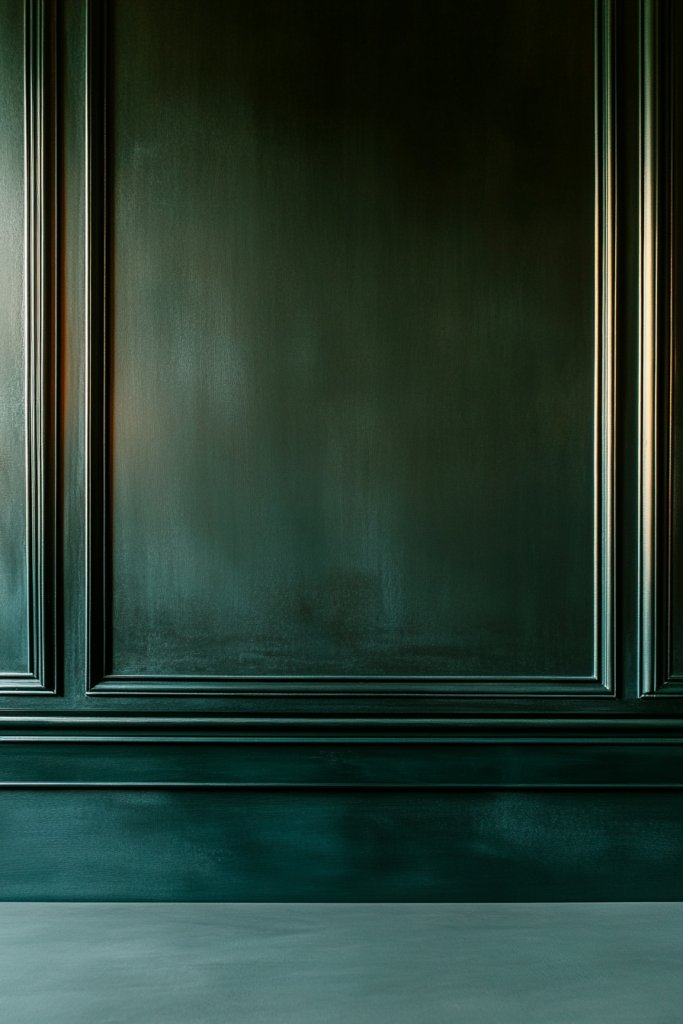 Imagine dark green-painted wall moldings framing sections of your walls or creating a picture frame effect around a focal area. The matte finish deepens the mood while the geometric or classic patterns add elegance. This architectural feature balances the room’s proportions and highlights other design elements, like textured textiles or subtle lighting.