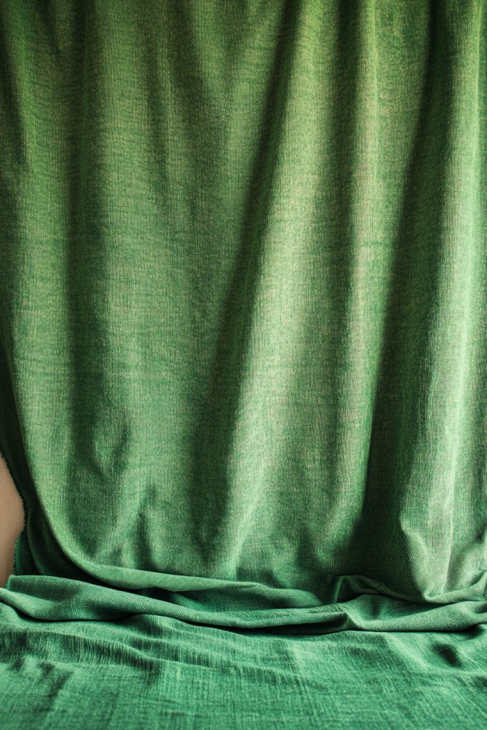 Visualize a lush, textured tapestry in rich emerald or moss green hanging on a wall, adding softness and depth. The fabric’s tactile surface contrasts beautifully with smooth walls and bedding. Layered with other textiles or decorative rods, it creates a warm focal point. The fabric’s folds and textures play with light, making the space feel layered and inviting.