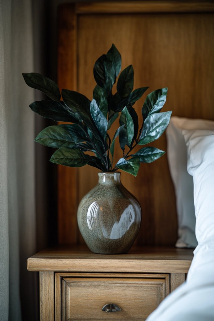 Want a touch of nature without the fuss of real plants? Faux greenery in stylish vases offers a maintenance-free way to bring life and freshness into your bedroom. It adds a natural vibe that complements moody green decor without requiring watering or sunlight. Sounds perfect, right?