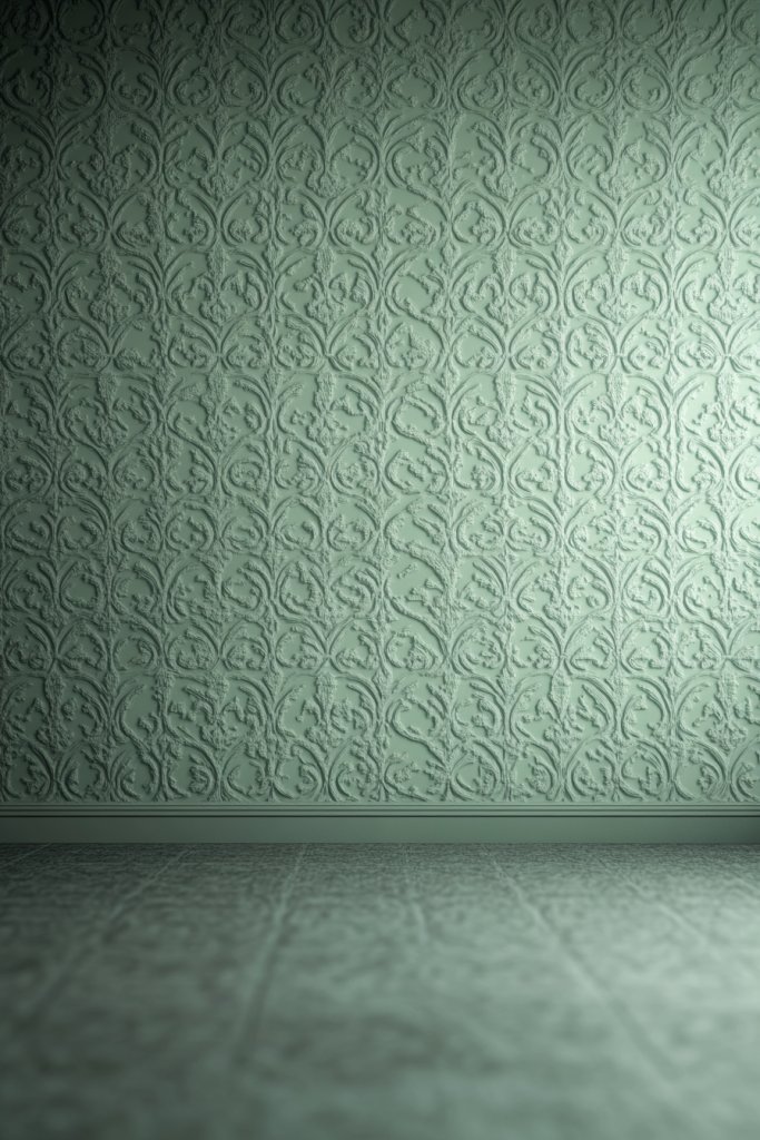 Imagine a delicate damask or geometric pattern in dark or muted green tones covering your walls. The pattern adds subtle movement and dimension, catching light softly throughout the day. It pairs beautifully with plain or textured bedding and minimal decor. The overall effect is sophisticated and layered, creating a tranquil yet intriguing environment.
