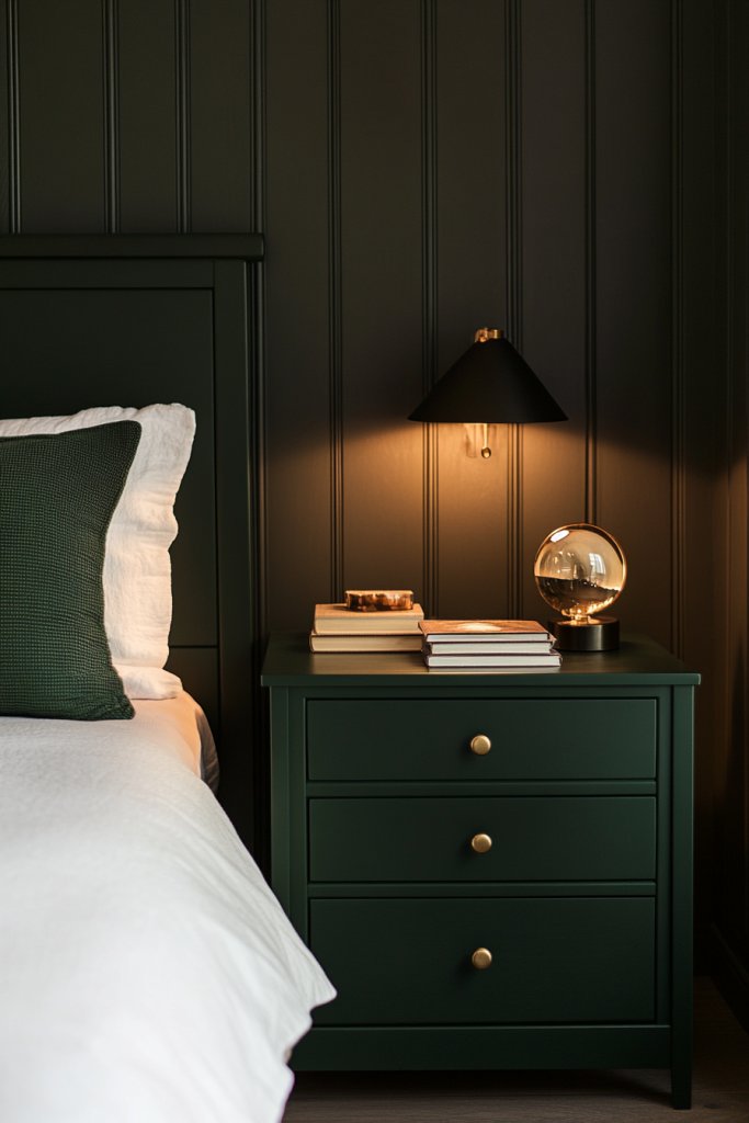 Dark green nightstands with a minimalist design create a sleek, organized bedroom environment. They’re versatile, functional, and stylish, making your space feel calm and put-together. With simple, thoughtful choices, your bedroom will radiate effortless sophistication. Ready to streamline?
