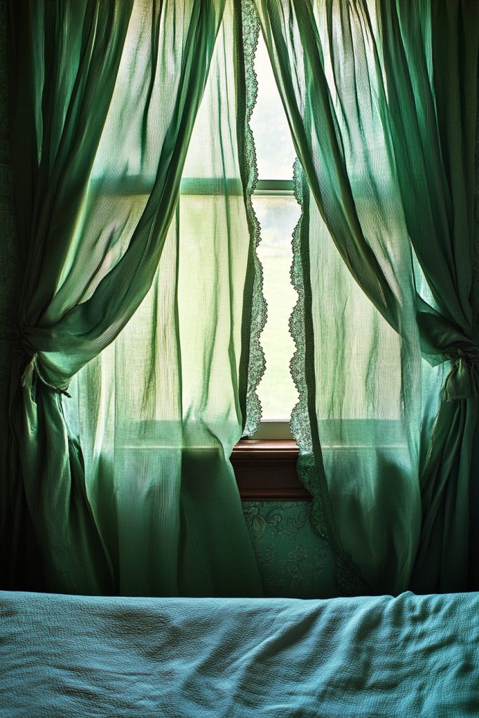 Picture sheer green curtains layered with heavier drapes in matching or contrasting shades. During the day, the sheers diffuse natural light, creating a gentle glow. At night, close the heavier curtains for privacy and a cocoon-like atmosphere. The fabrics—linen, velvet, or textured cotton—add softness and richness, making your windows a focal point.