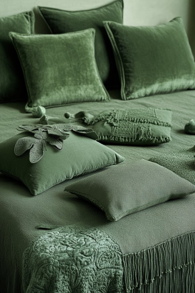 Imagine green candles, trays, and decorative bowls in various shades—from mint to deep emerald—placed strategically throughout your room. These accents subtly echo the wall color and textiles, reinforcing the calming vibe. The different shades add visual depth without disrupting the monochrome look. The overall effect is soothing, elegant, and well-balanced.