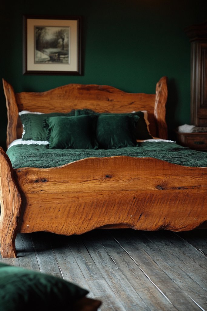 A rustic wooden bed with dark green accents turns your bedroom into a peaceful retreat reminiscent of a mountain lodge. It’s a timeless style that combines comfort with natural beauty. With the right touches, your space will feel warm, inviting, and uniquely yours. Ready to embrace the rustic charm?